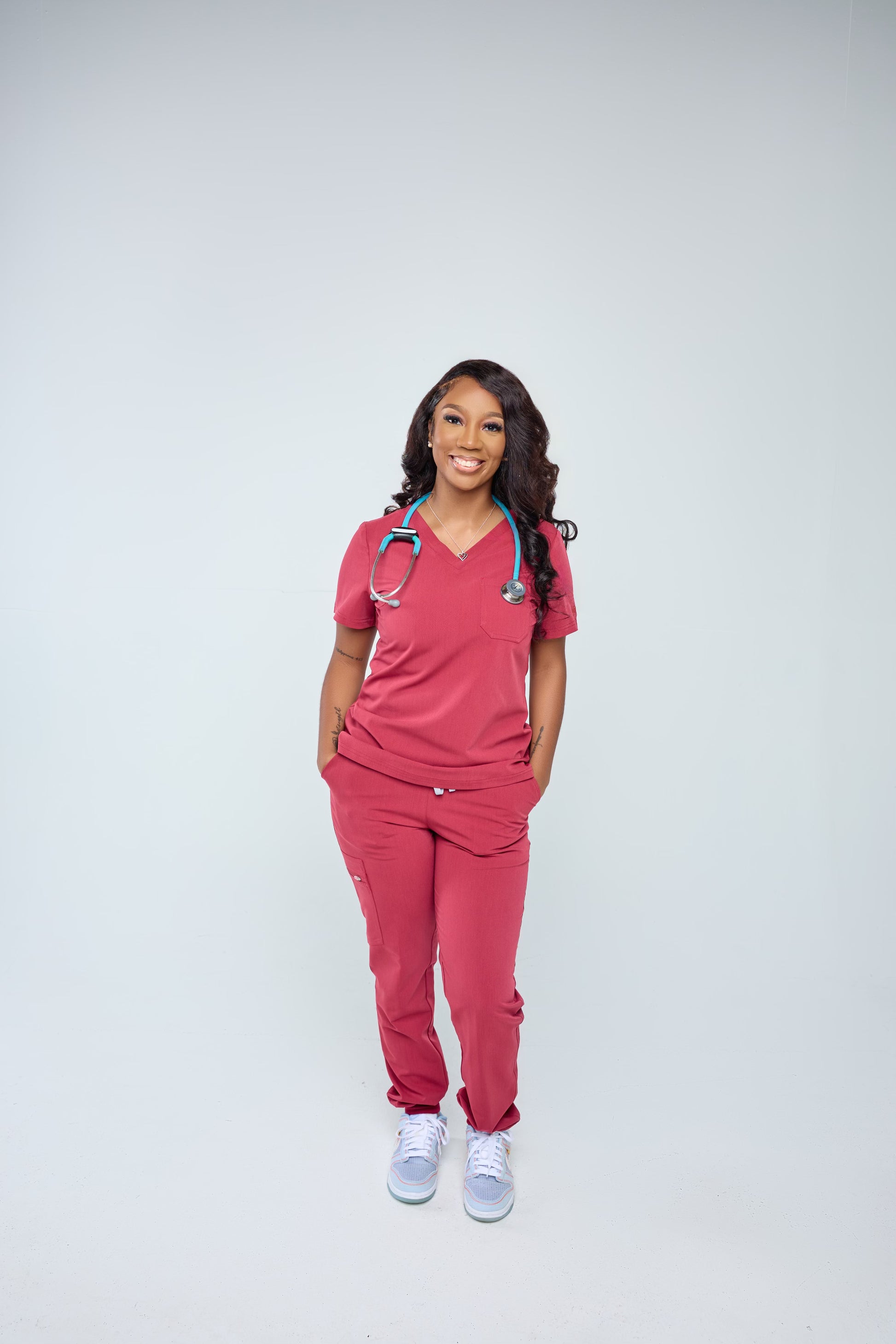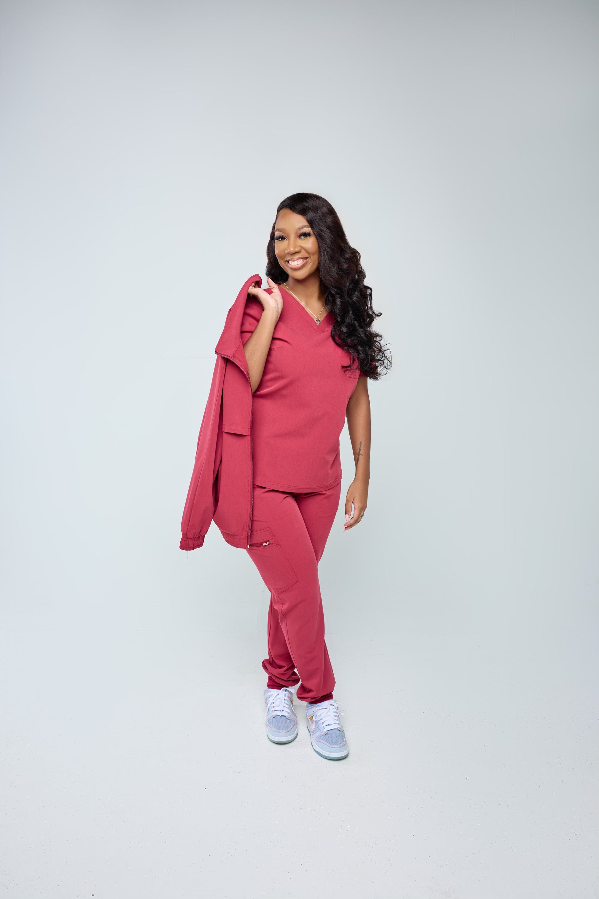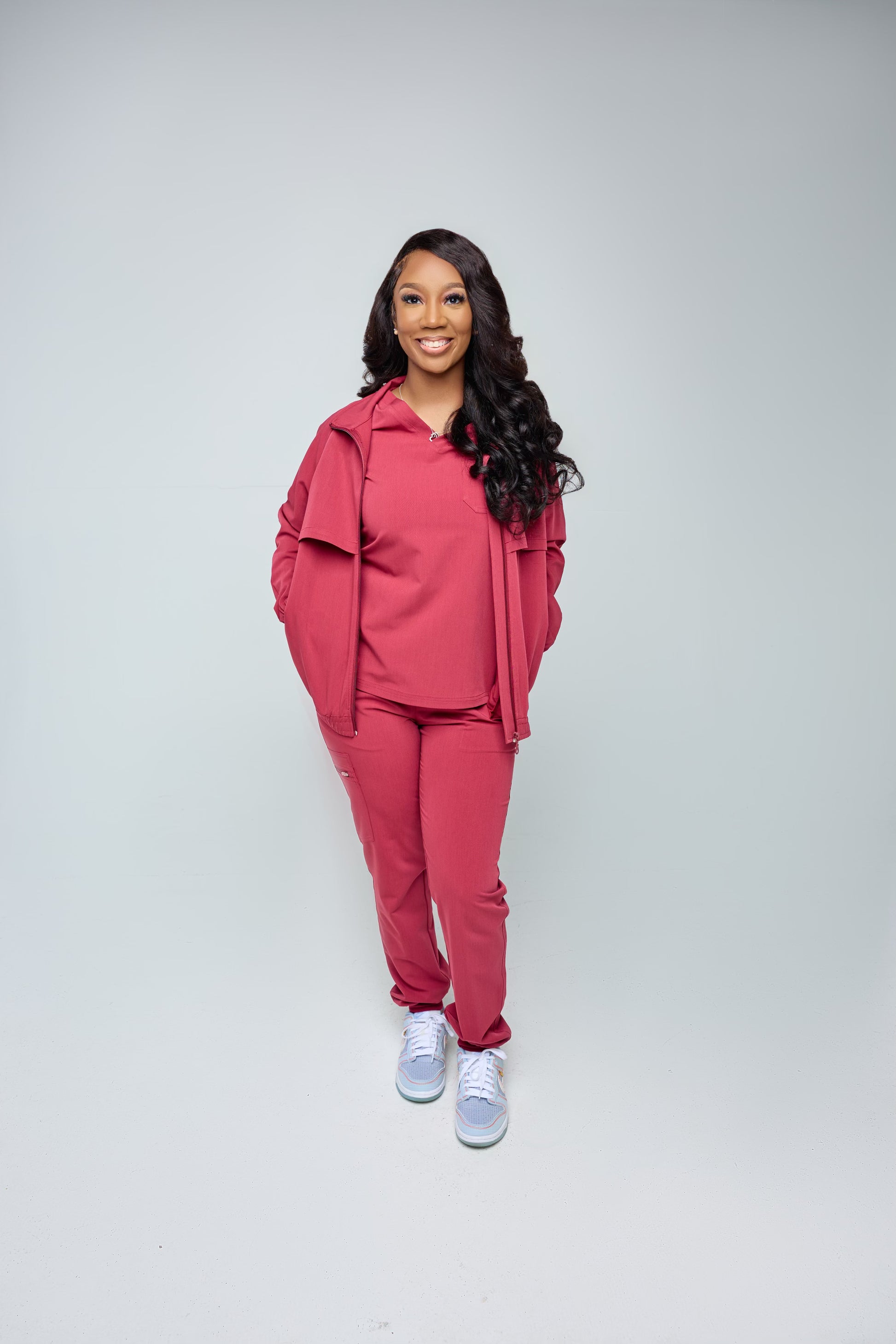Three piece set with jacket for flexible wear regardless of temperature. Very good for cold climate in healthcare facilities and other businesses. This is a Unisex Set.